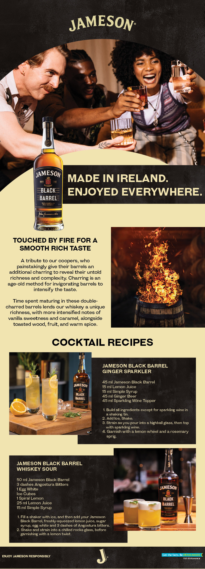 Charring is an age-old method for invigorating barrels to intensify the taste. Jameson Black Barrel is a tribute to coopers, who painstakingly give their bourbon barrels an additional charring to reveal their untold richness and complexity. Jameson Black Barrel Personal Irish Whiskey is matured in a combination of American oak, sherry casks, and double charred bourbon barrels. Time spent maturing in these barrels lends this whiskey intensified notes of Vanilla sweetness and Caramel, alongside toasted Wood, fruit and warm spice, an embellished finish to a triple distilled smoothness.