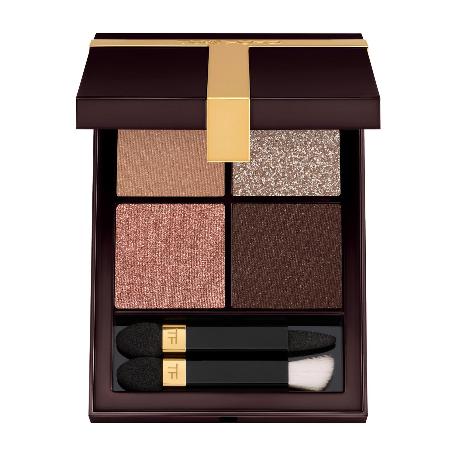The unmistakable TOM FORD T, as seen on iconic eyewear and accessories, is emblazoned on the Runway Eye Color Quad compacts. A gold-tone T indicates the Poudre formula, while matte brown signifies Crème.