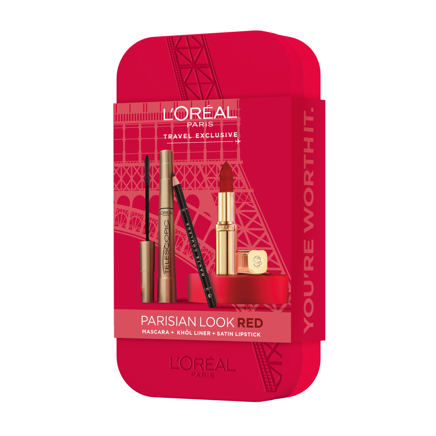 Get the bold Parisian red look from L'Oréal Paris with the Look On The Go Red Routine Makeup Set. Achieve the ultimate length and volume with the False Lash Telescopic Gold Mascara; its creamy texture and adaptable bristle will coat your lashes in a deep black for a bold look. Create a simple or dramatic liner with the Haute Couleur Crayon Khôl Eyeliner in Silk Black, that softly glides over the eyelid, allowing you to achieve a long-lasting and intense colour result.