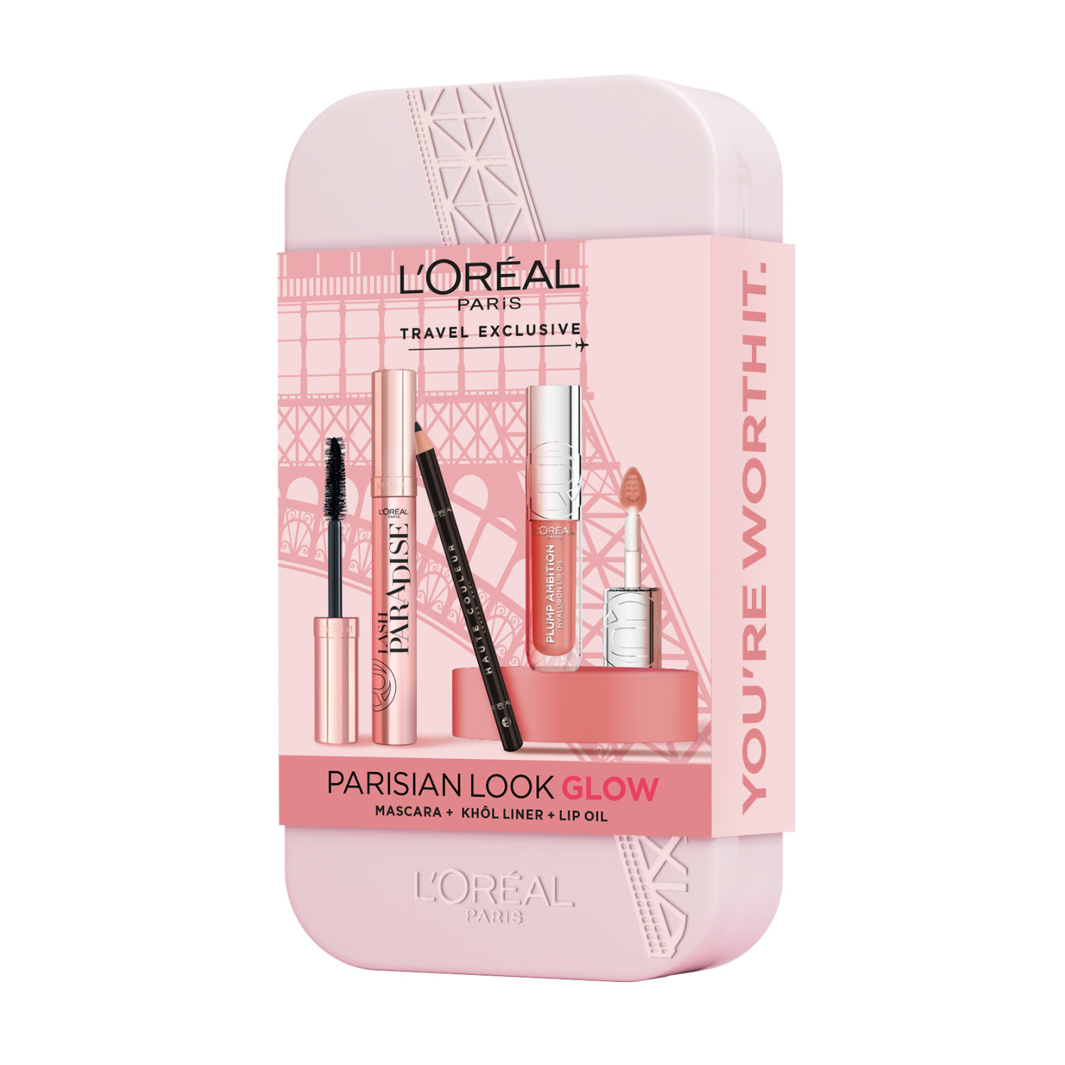 • Get the Parisian glow look from L'Oréal Paris with the Look On The Go Glow Routine Makeup Set. Achieve the ultimate length and volume with our bestseller Lash Paradise Volumising Mascara; enriched with lash-loving Castor Oil with a feather-soft feel. Create a simple or dramatic liner with the Haute Couleur Crayon Khôl in NoirSilk, that softly glides over the eyelid, allowing you to achieve a long-lasting and intense colour result.