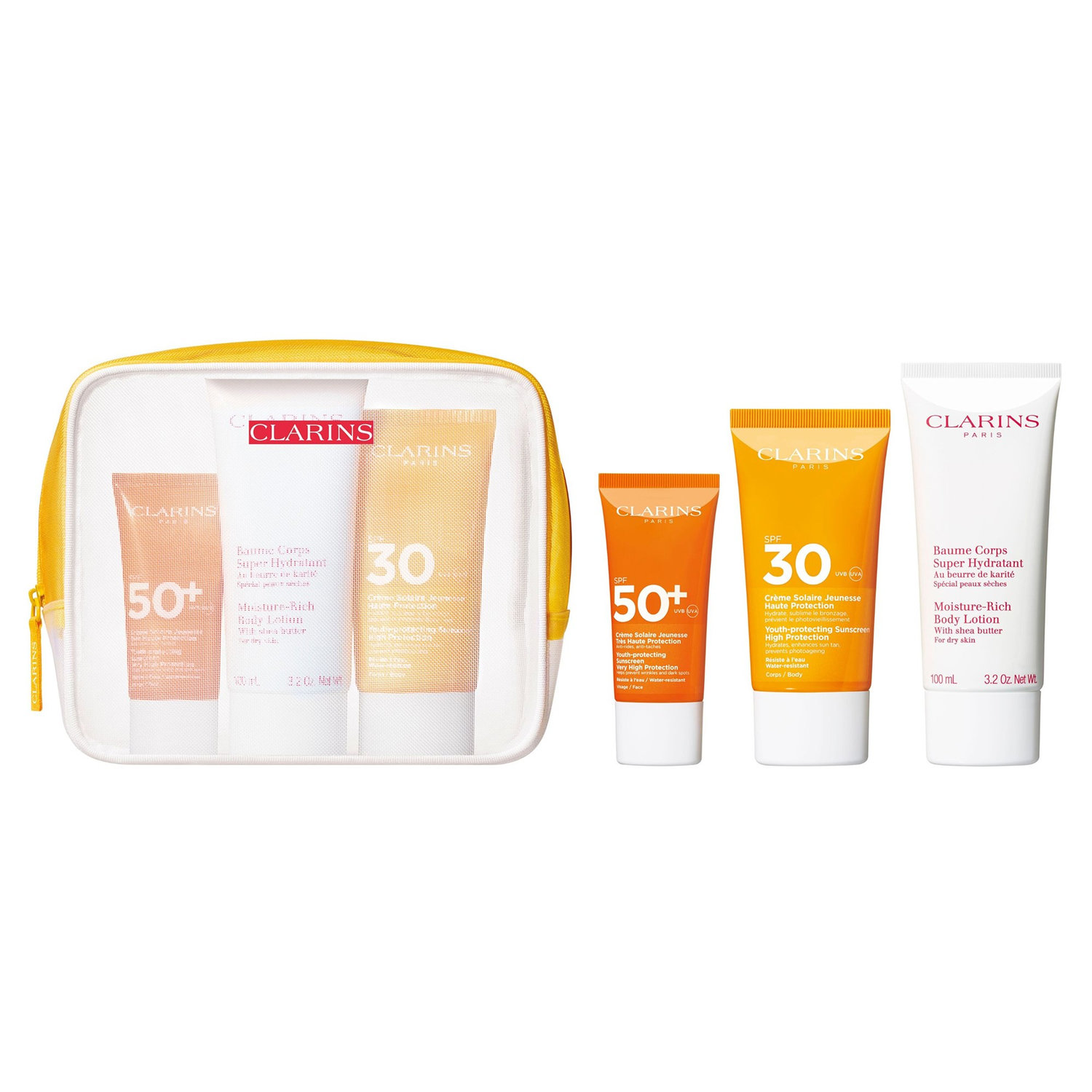 Travel with Clarins, your Beauty Expert. Don't take off without your summer essentials: sun care for the face and body along with a moisture rich body lotion.