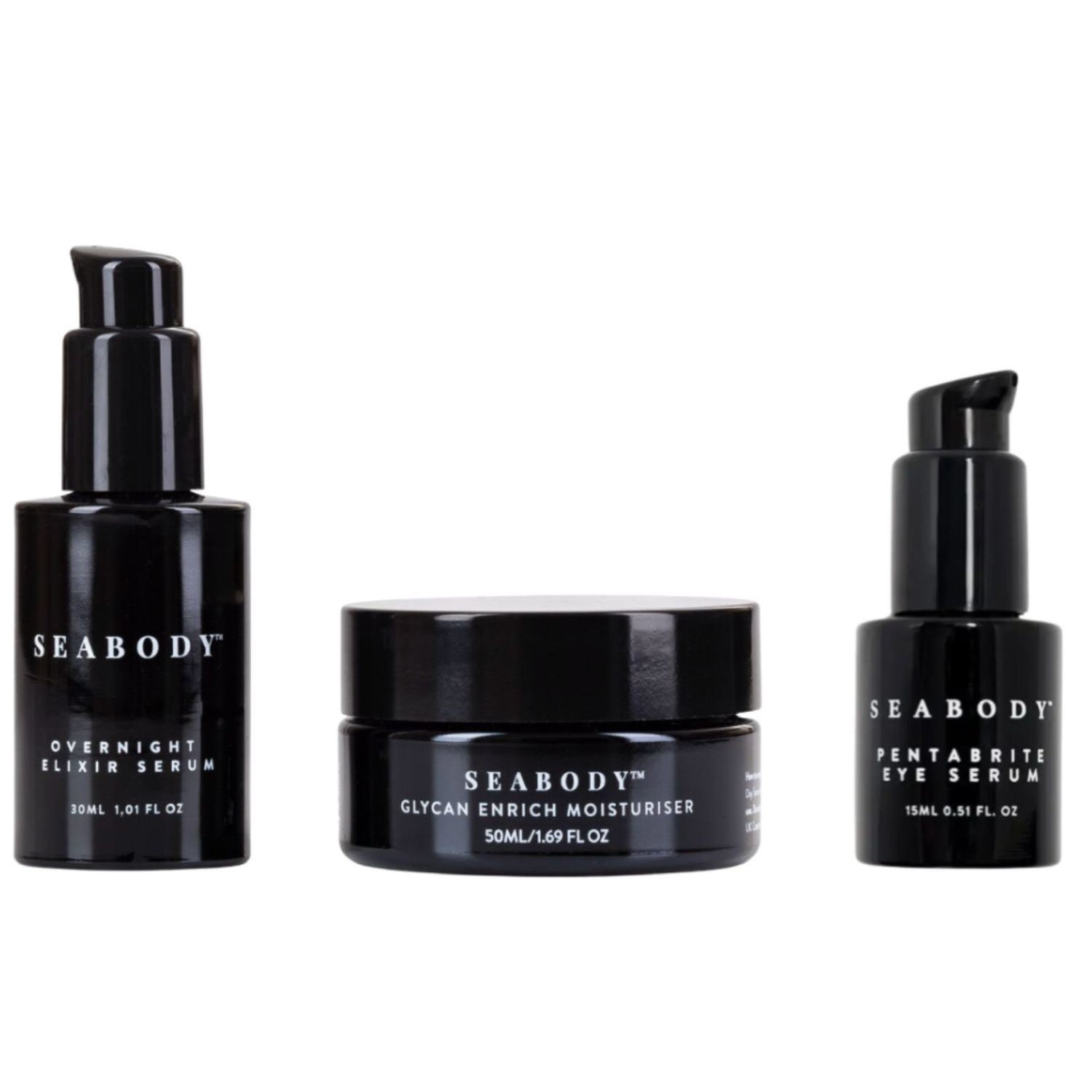 A luxurious three step night time ritual curated to deliver targeted results. Featuring SEABODY’s Overnight Elixir Serum, Pentabrite Eye Serum and Glycan Enrich Moisturiser, this set targets visible signs of aging. Ideal for those seeking science-led skincare, this indulgent gift set harnesses marine bioactives to reveal firmer, more radiant looking skin.