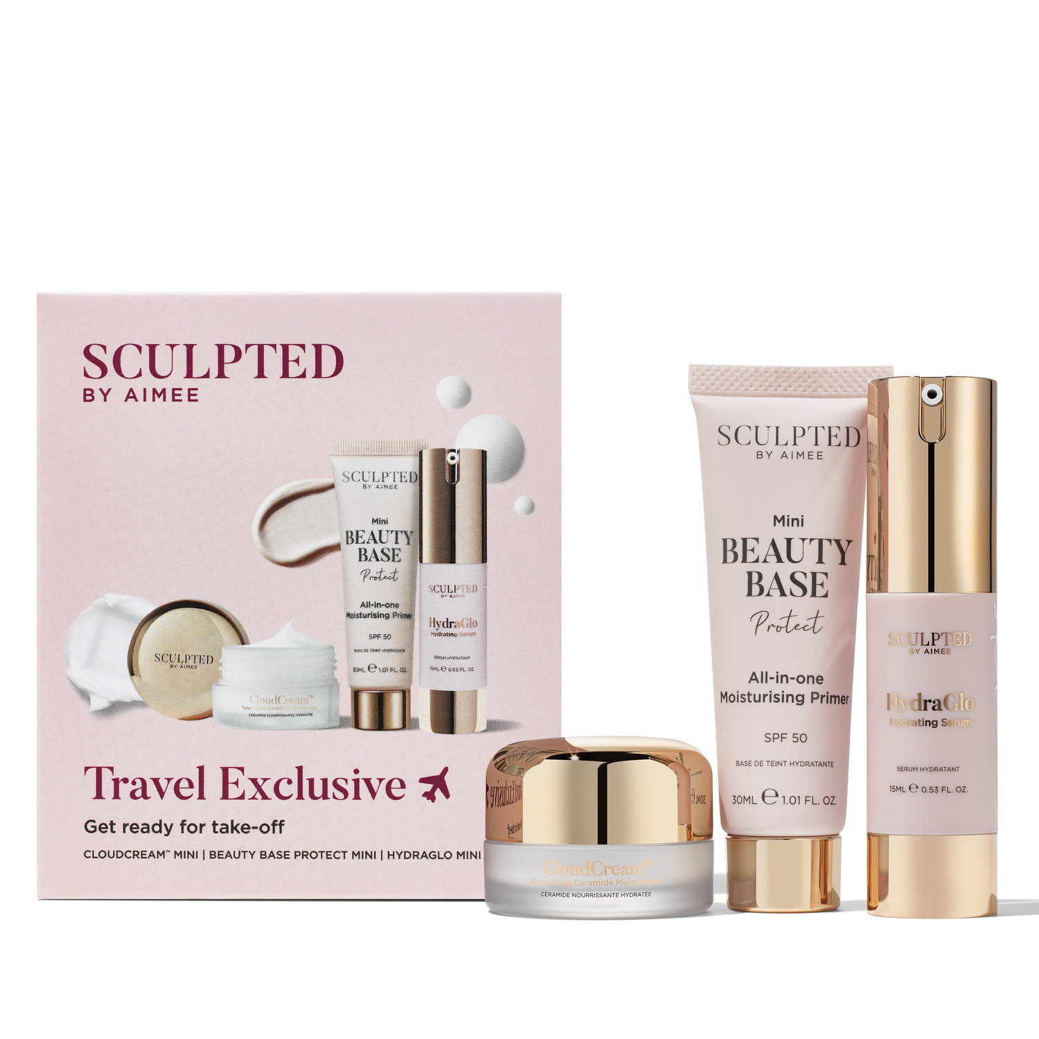 Going somewhere? Take us with you. This exclusive, flight-friendly kit packs a trio of Sculpted essentials for hydration, protection, and glow on the go.