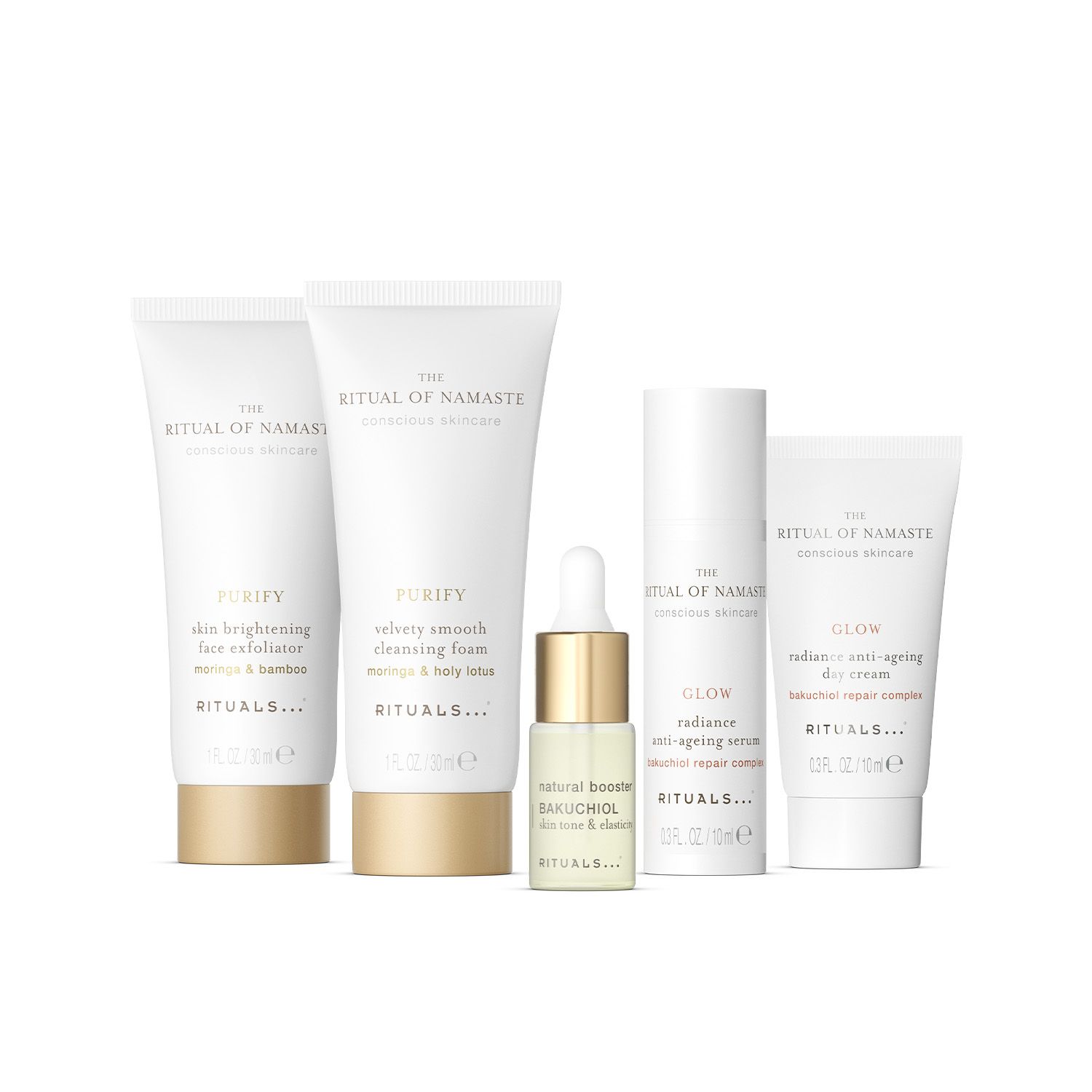 This set contains The Ritual of Namaste skin brightening face exfoliator (30ml), The Ritual of Namaste bakuchiol booster (4ml), The Ritual of Namaste velvety smooth cleansing foam (30ml), The Ritual of Namaste anti-ageing day cream (10ml) and The Ritual of Namaste anti-ageing serum (10ml).