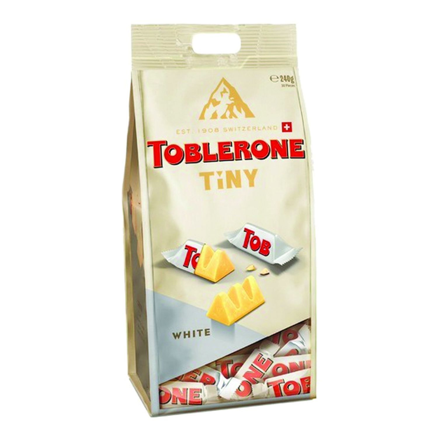Toblerone Tiny White - the iconic white chocolate with honey and almond nougat - offered in a shiny, travel exclusive white bag of 32 individually wrapped snack-sized pieces - a convenient treat for white chocolate lovers.
