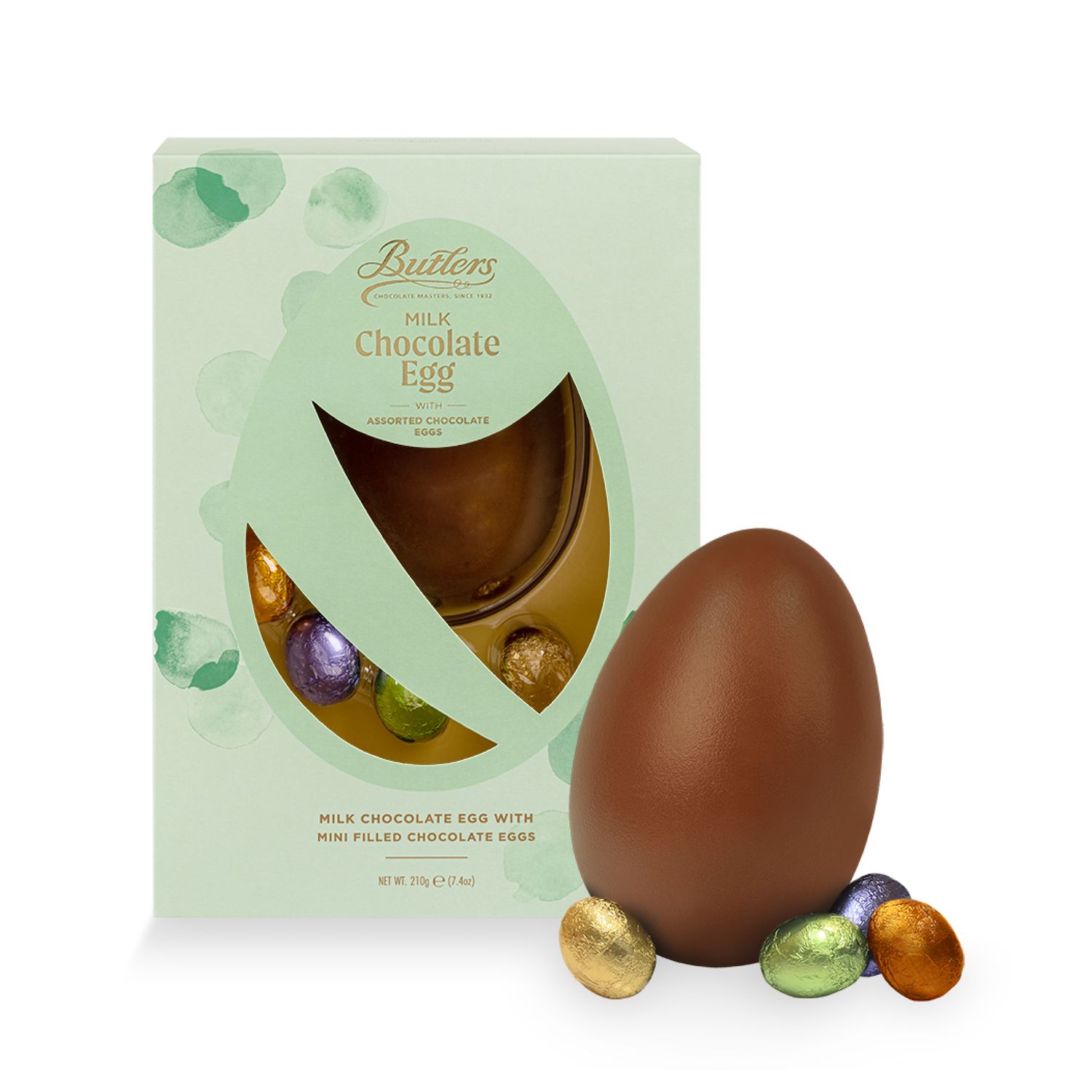 • A small milk chocolate egg with an assortment of 4 filled mini Easter eggs.