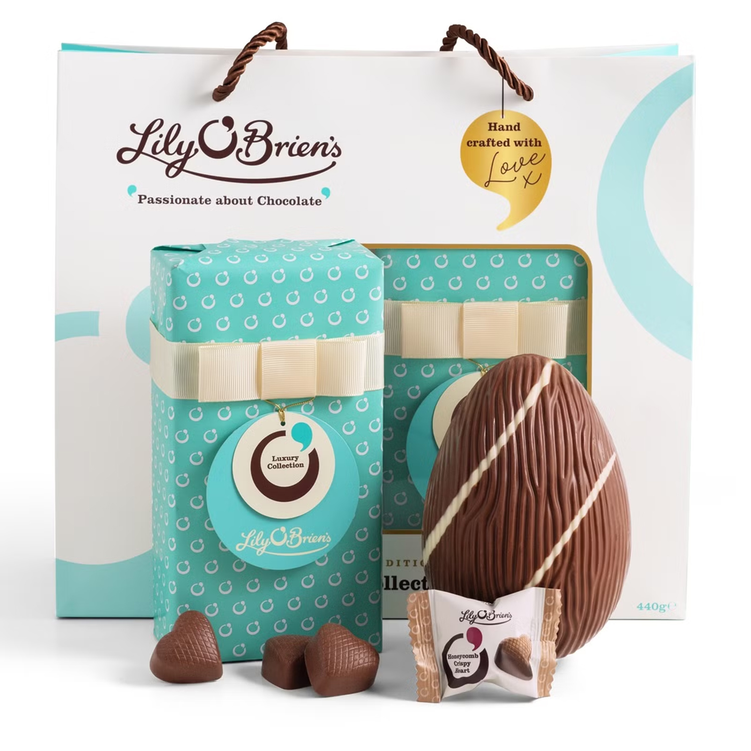 A luxury gift bag containing a selection of Lily O'Brien's Chocolates.Each gift bag contains a Milk Chocolate Egg with Honeycomb Crispy Hearts and a Luxury Collection box of chocolates.