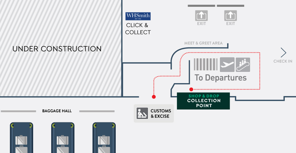 After you pass through the customs screening area, walk through to the arrivals area and turn right. Proceed straight until you reach the Click & Collect desk. Should you have any difficulty finding it, please do not hesitate to ask a member of staff – they will be happy to assist you.