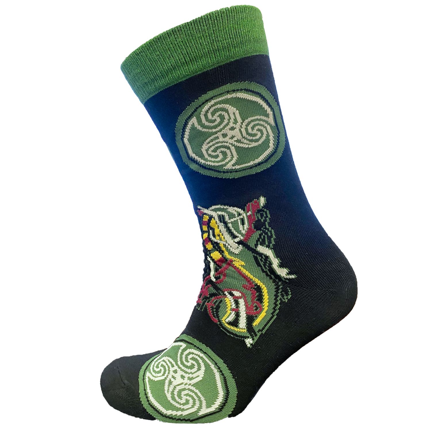 These men's socks, inspired by the timeless designs of the Book of Kells, combine classic black with vibrant green. Crafted for comfort and style, they infuse a hint of Celtic heritage into any attire, making them a sophisticated choice for any occasion.