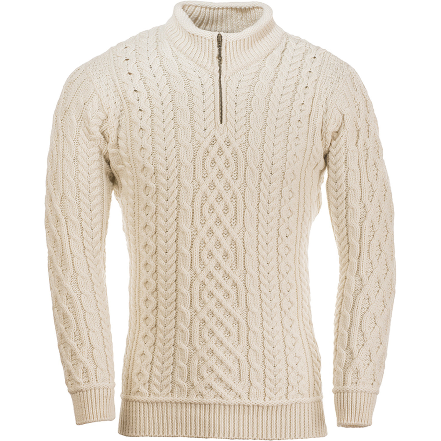 A Celtic trellis stitch features as the central panel which changes into mirrored rope cables either side of the ¼ zip. A variety of traditional Aran stitches are showcased with a metal zip that is antique brass colour with a matching ball end zip pull.