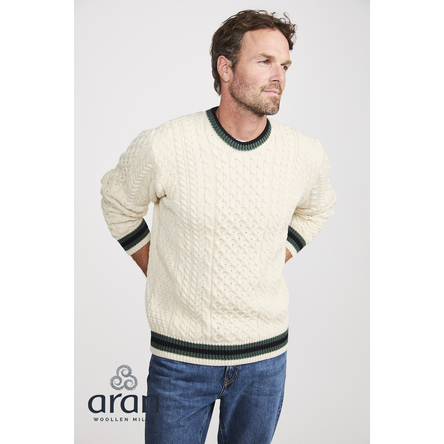 A contemporary update to the traditional Aran sweater, with the addition of stripes to the collar, cuffs and hem, delivering a preppy, sporty angle to the classic style.
